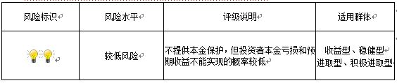 本期产品为非保本浮动收益型理财产品,不保证本金和收益,请您充分认识投资风险,谨慎投资。本期产品期限80天(中国建设银行有权对本期产品进行展期和提前终止),存续期内产品不接受申购或赎回申请。本期产品内部风险评级级别为2盏警示灯 ,风险程度属于较低风险。最不利情况下,资产组合无法回收任何本金和净收益,客户将损失全部本金。产品适合于收益型、稳健型、进取型、积极进取型客户。
