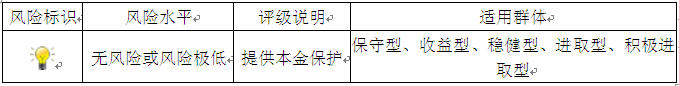 本期产品为保本浮动收益型理财产品,本理财产品有投资风险,只保障理财资金本金,不保证理财收益,您应当充分认识投资风险,谨慎投资。本期产品期限为94天(中国建设银行有权对产品进行展期或提前终止)。本期产品内部风险评级级别为一盏警示灯,风险程度属于无风险或风险极低,适用于保守型、收益型、稳健型、进取型及积极进取型投资者。最不利情况下,客户只能收回投资本金,不能获得任何投资收益。