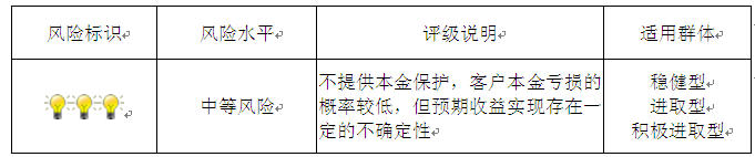 本期产品为非保本浮动收益型理财产品,不保证本金和收益,请您充分认识投资风险,谨慎投资。本期产品期限100天(中国建设银行有权对本期产品进行展期和提前终止),存续期内产品不接受申购或赎回申请。本期产品内部风险评级级别为3盏警示灯 ,风险程度属于中等风险。最不利情况下,资产组合无法回收任何本金和净收益,客户将损失全部本金。产品适合于稳健型、进取型及积极进取型客户。