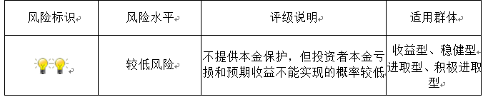 本期产品为非保本浮动收益型理财产品,不保证本金和收益,请您充分认识投资风险,谨慎投资。本期产品期限111天(中国建设银行有权对本期产品进行展期和提前终止),存续期内产品不接受申购或赎回申请。本期产品内部风险评级级别为2盏警示灯 ,风险程度属于较低风险。最不利情况下,资产组合无法回收任何本金和净收益,客户将损失全部本金。产品适合于收益型、稳健型、进取型、积极进取型客户。