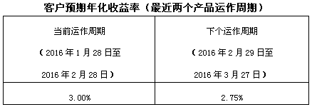 下个运作周期客户预期年化收益率于2016年2月29日(含)开始执行。