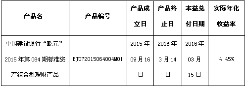 中国建设银行“乾元”2015年第064期标准资产组合型理财产品兑付公告