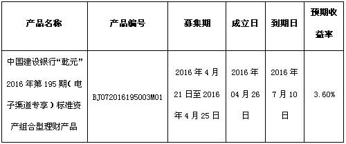 中国建设银行“乾元”2016年第195期(电子渠道专享)标准资产组合型理财产品成立公告
