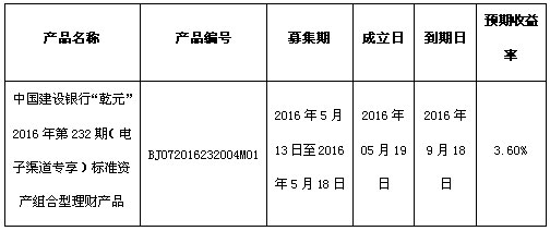 中国建设银行“乾元”2016年第232期(电子渠道专享)标准资产组合型理财产品成立公告