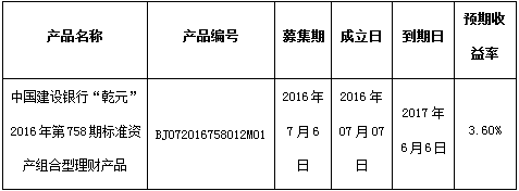 中国建设银行“乾元”2016年第758期标准资产组合型理财产品成立公告