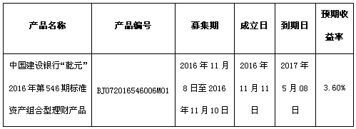 中国建设银行“乾元”2016年第546期标准资产组合型理财产品成立公告