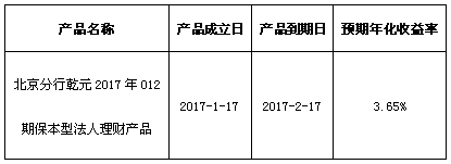 关于北京分行乾元2017年012期保本型法人理财产品成立的公告
