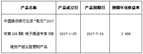 关于中国建设银行北京“乾元”2017年第026期(电子渠道专享)标准资产组合型理财产品成立的公告