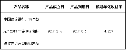 关于中国建设银行北京“乾元”2017年第042期标准资产组合型理财产品成立的公告