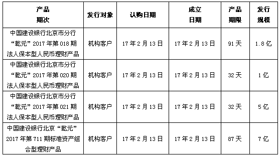 中国建设银行北京市分行定于2017年2月13日发行理财产品,现将相关发行情况公告如下: