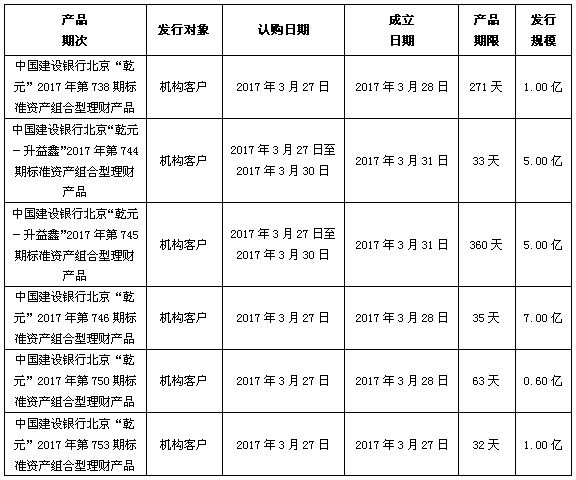 中国建设银行北京市分行定于2017年3月27日发行理财产品,现将相关发行情况公告如下: