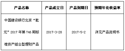 关于中国建设银行北京“乾元”2017年第746期标准资产组合型理财产品成立的公告