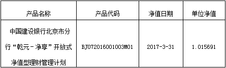 中国建设银行北京市分行“乾元-净享”开放式净值型理财管理计划净值公布如下:
