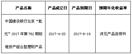 关于中国建设银行北京“乾元”2017年第762期标准资产组合型理财产品成立的公告