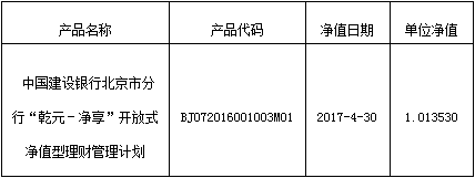 中国建设银行北京市分行“乾元-净享”开放式净值型理财管理计划净值公布如下: