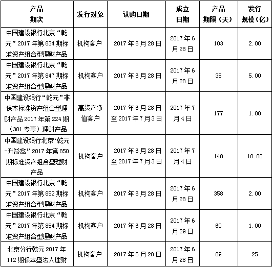中国建设银行北京市分行定于2017年6月28日发行理财产品,现将相关发行情况公告如下: