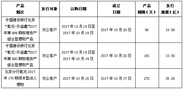 中国建设银行北京市分行定于2017年10月16日发行理财产品,现将相关发行情况公告如下: