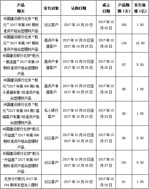 中国建设银行北京市分行定于2017年10月20日发行理财产品,现将相关发行情况公告如下: