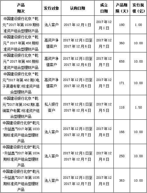 中国建设银行北京市分行定于2017年12月1日发行理财产品,现将相关发行情况公告如下:
