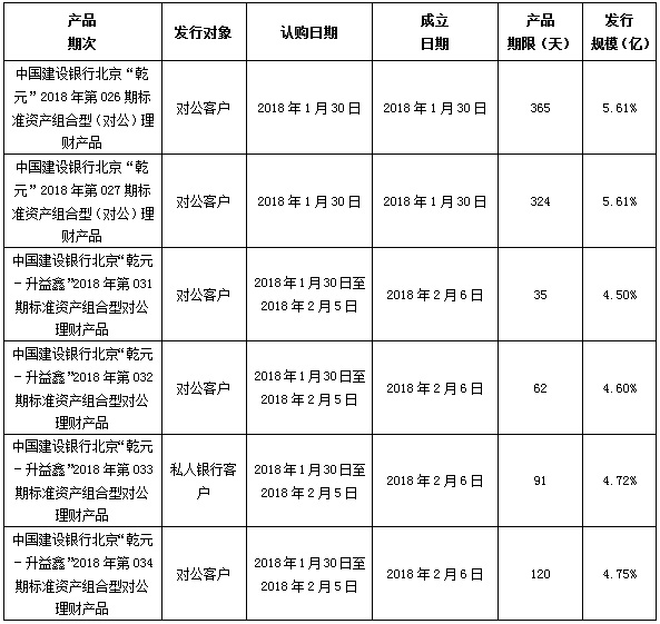 中国建设银行北京市分行定于2018年1月30日发行理财产品,现将相关发行情况公告如下: