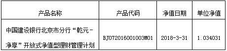 中国建设银行北京市分行“乾元-净享”开放式净值型理财管理计划净值公布如下: