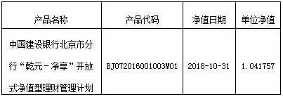 中国建设银行北京市分行“乾元-净享”开放式净值型理财管理计划净值公布如下:
