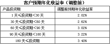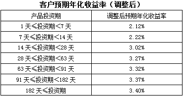 上述调整后的客户预期年化收益率拟于2018年12月12日(含)开始执行。对于2018年12月12日前已经申购成功且未赎回的所有存量客户理财资金,2018年12月12日前执行原有客户预期年化收益率标准,2018年12月12日(含)后执行调整后客户预期年化收益率标准。