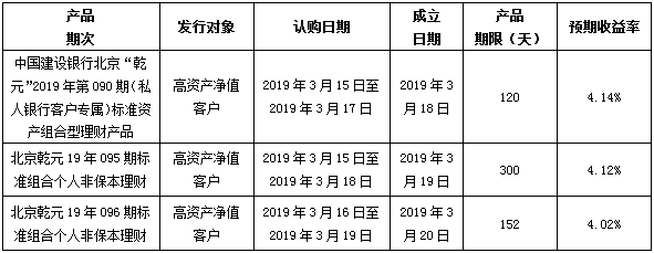 中国建设银行北京市分行定于2019年3月15日发行理财产品,现将相关发行情况公告如下: