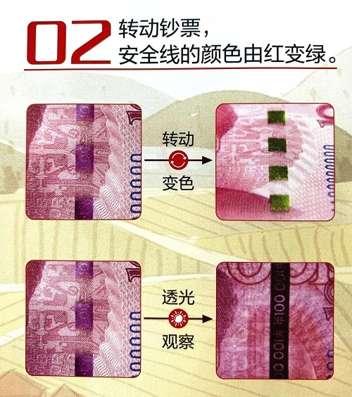 2.转动钞票观察,100、50、20、10元票面正面右侧的安全线颜色由红色变为绿色。