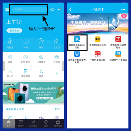1.客户通过建行手机银行APP“一键绑卡”功能完成支付宝快捷支付首绑建行卡,借记卡可获得10元建行借记卡消费红包;贷记卡可获得15元建行贷记卡消费红包。