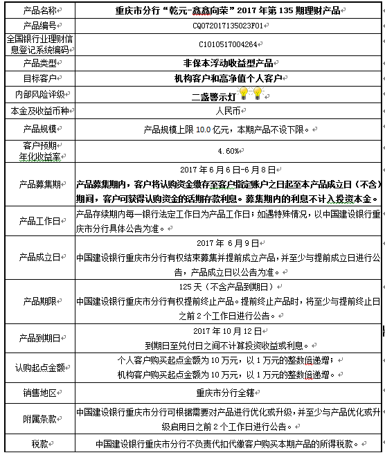 本产品为非保本浮动收益型理财产品,不保证本金和收益,请您充分认识投资风险,谨慎投资。本期产品期限为125天(中国建设银行有权对产品进行展期或提前终止),存续期内,产品不接受申购或赎回申请。本期产品内部风险评级级别为二盏警示灯,风险水平属于较低风险。最不利情况下,您将损失全部收益甚至包括全部本金。本理财产品适用于收益型、稳健型、进取型 、积极进取型客户。