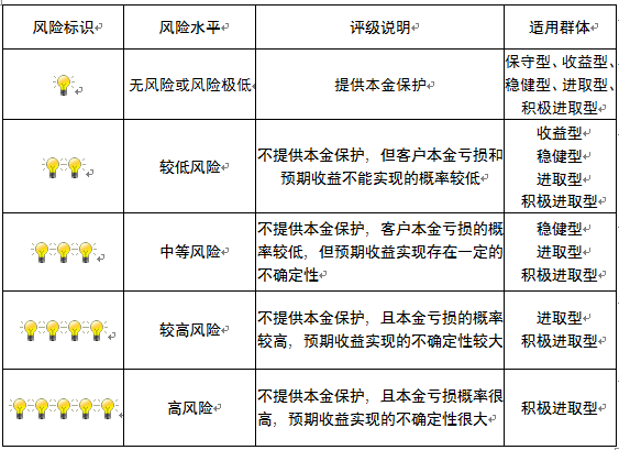 本产品为非保本浮动收益型理财产品,不保证本金和收益,请您充分认识投资风险,谨慎投资。本期产品期限为107天(中国建设银行有权对产品进行展期或提前终止),存续期内,产品不接受申购或赎回申请。本期产品内部风险评级级别为二盏警示灯,风险水平属于较低风险。最不利情况下,您将损失全部收益甚至包括全部本金。本理财产品适用于收益型、稳健型、进取型 、积极进取型客户。