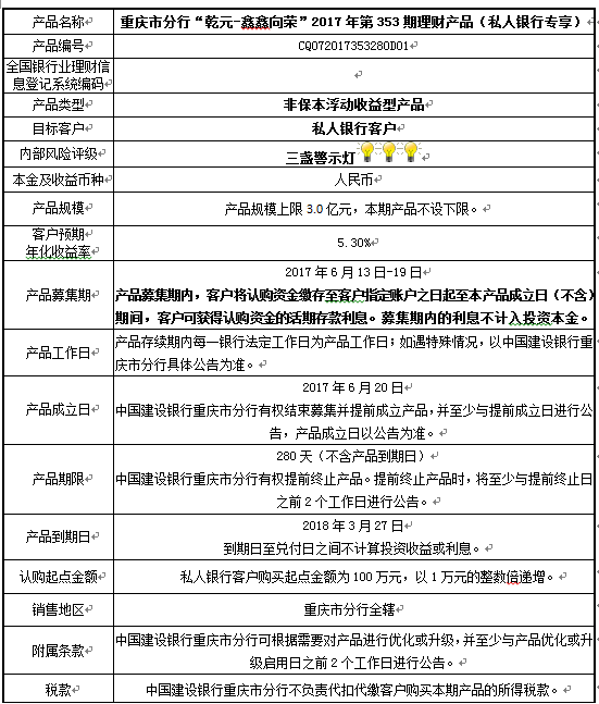 1.本期产品规模上限:3.0亿元。在本期产品募集期内,对本期产品的认购金额达到本期理财产品规模上限,则中国建设银行重庆市分行有权利但无义务停止本期产品的认购,已经认购成功的客户投资权益不受影响。