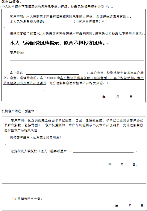 您签署本风险揭示书、客户协议书,并将资金委托给中国建设银行重庆市分行运作是您真实的意思表示。本风险揭示书及相应的客户协议书、产品说明书、客户权益须知将共同构成贵我双方理财合同的有效组成部分。