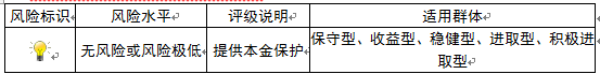 本期产品为保本浮动收益型理财产品,本理财产品有投资风险,只保障理财资金本金,不保证理财收益,您应当充分认识投资风险,谨慎投资。本期产品期限为33天(中国建设银行有权对产品进行展期或提前终止)。本期产品内部风险评级级别为一盏警示灯,风险程度属于无风险或风险极低,适用于保守型、收益型、稳健型、进取型及积极进取型投资者。最不利情况下,客户只能收回投资本金,不能获得任何投资收益。