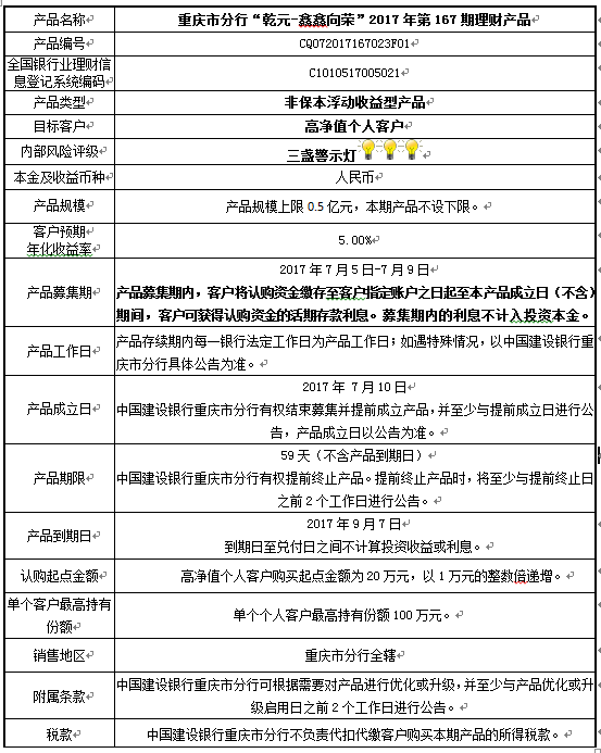 1.本期产品规模上限:0.5亿元。在本期产品募集期内,对本期产品的认购金额达到本期理财产品规模上限,则中国建设银行重庆市分行有权利但无义务停止本期产品的认购,已经认购成功的客户投资权益不受影响。