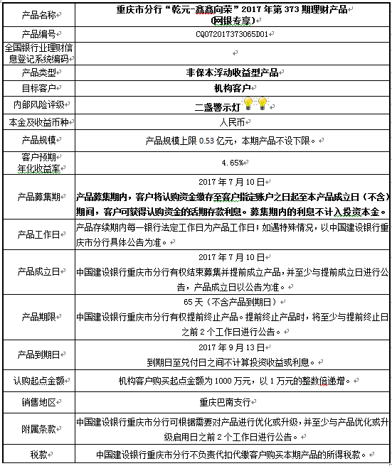 中国建设银行重庆市分行“乾元-鑫鑫向荣” 2017年第373期理财产品风险揭示书和产品说明书