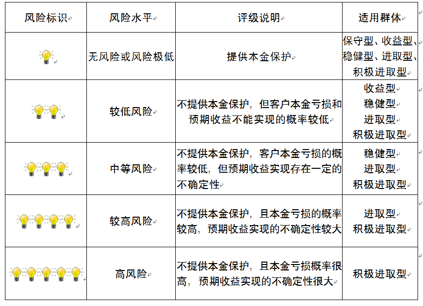 ,风险水平属于较低风险。最不利情况下,您将损失全部收益甚至包括全部本金。本理财产品适用于收益型、稳健型、进取型 、积极进取型客户。