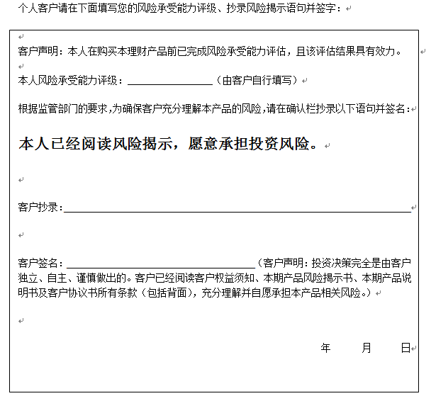 在您签署《中国建设银行股份有限公司理财产品客户协议书》前,应当仔细阅读客户权益须知、本风险揭示书及本产品的产品说明书的全部内容,同时向中国建设银行了解本产品的其他相关信息,并自己独立做出是否认(申)购本产品的决定。