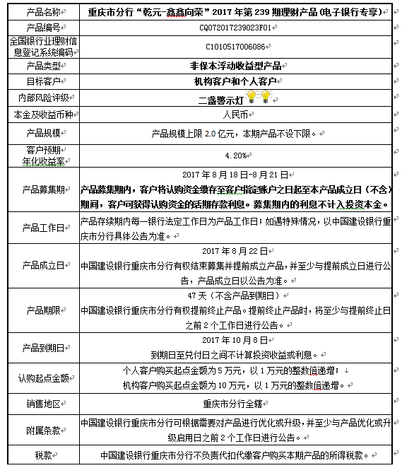 中国建设银行重庆市分行“乾元-鑫鑫向荣” 2017年第239期理财产品风险揭示书和产品说明书