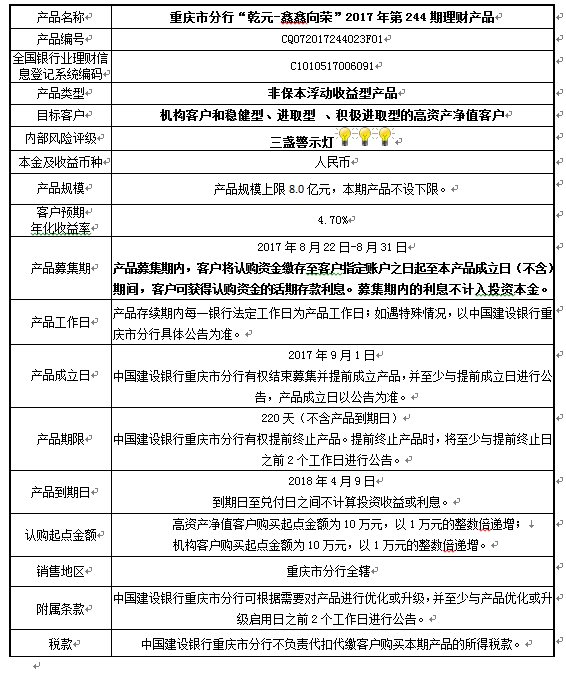 1.本期产品规模上限:8.0亿元。在本期产品募集期内,对本期产品的认购金额达到本期理财产品规模上限,则中国建设银行重庆市分行有权利但无义务停止本期产品的认购,已经认购成功的客户投资权益不受影响。