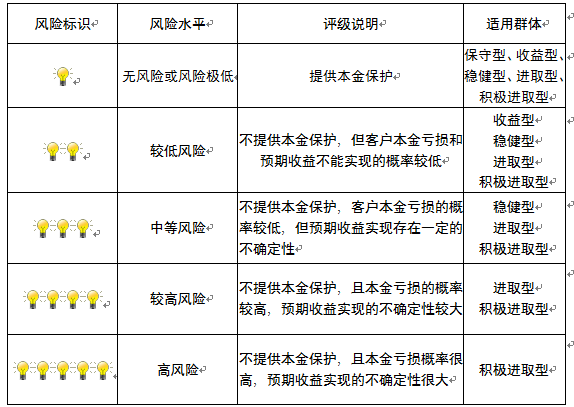 本产品为非保本浮动收益型理财产品,不保证本金和收益,请您充分认识投资风险,谨慎投资。本期产品期限为90天(中国建设银行有权对产品进行展期或提前终止),存续期内,产品不接受申购或赎回申请。本期产品内部风险评级级别为盏警示灯,风险水平属于较低风险。最不利情况下,您将损失全部收益甚至包括全部本金。本理财产品适用于收益型、稳健型进取型 积极进取型客户。