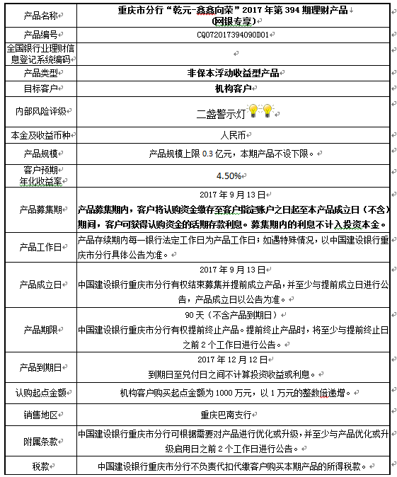 中国建设银行重庆市分行“乾元-鑫鑫向荣” 2017年第394期理财产品风险揭示书和产品说明书