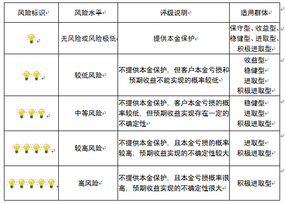 本产品为非保本浮动收益型理财产品,不保证本金和收益,请您充分认识投资风险,谨慎投资。本期产品期限为150天(中国建设银行有权对产品进行展期或提前终止),存续期内,产品不接受申购或赎回申请。本期产品内部风险评级级别为盏警示灯,风险水平属于较低风险。最不利情况下,您将损失全部收益甚至包括全部本金。本理财产品适用于收益型、稳健型、进取型 积极进取型客户。