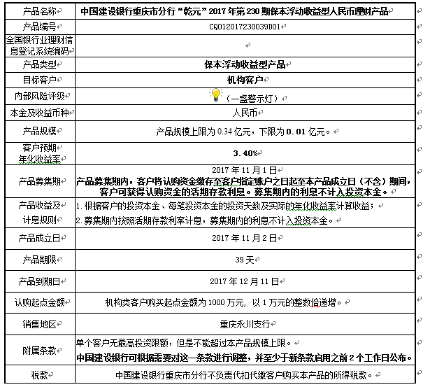 1.本产品规模上限:0.34亿元。在本期产品募集期内,对本期产品的认购金额达到本期理财产品规模上限,则中国建设银行重庆市分行有权利但无义务停止本期产品的认购,已经认购成功的客户投资权益不受影响。