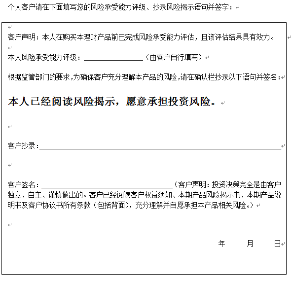 在您签署《中国建设银行股份有限公司理财产品客户协议书》前,应当仔细阅读客户权益须知、本风险揭示书及本产品的产品说明书的全部内容,同时向中国建设银行了解本产品的其他相关信息,并自己独立做出是否认(申)购本产品的决定。