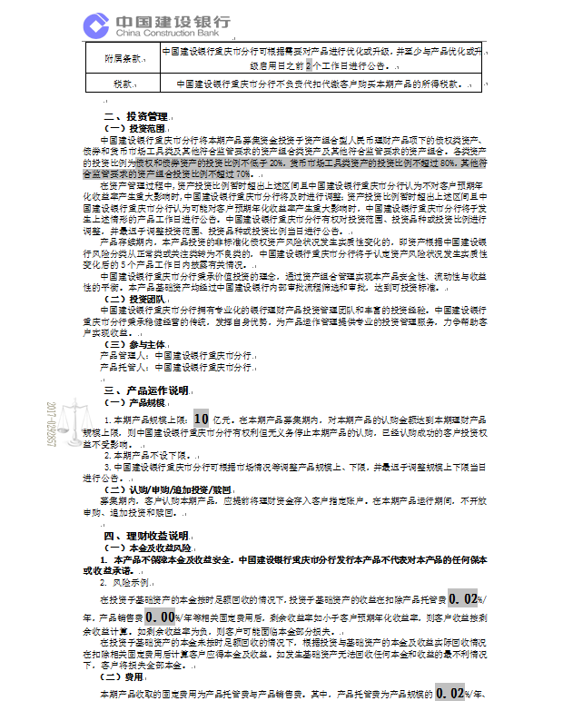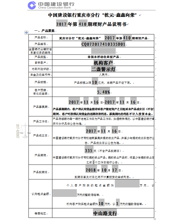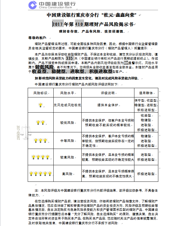 中国建设银行重庆市分行“乾元-鑫鑫向荣” 2017年第410期理财产品说明书和风险揭示书