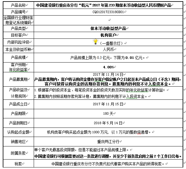 1.本产品规模上限:0.3亿元。在本期产品募集期内,对本期产品的认购金额达到本期理财产品规模上限,则中国建设银行重庆市分行有权利但无义务停止本期产品的认购,已经认购成功的客户投资权益不受影响。