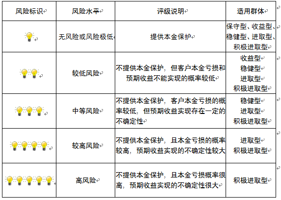 本产品为非保本浮动收益型理财产品,不保证本金和收益,请您充分认识投资风险,谨慎投资。本期产品期限为366天(中国建设银行有权对产品进行展期或提前终止),存续期内,产品不接受申购或赎回申请。本期产品内部风险评级级别为盏警示灯 ,风险水平属于中等风险。最不利情况下,您将损失全部收益甚至包括全部本金。本理财产品适用于稳健型、进取型 积极进取型客户。