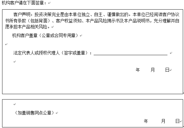 客户签名: ( 客户声明:投资决策完全是由客户独立、自主、谨慎做出的。客户已经阅读客户协议书所有条款(包括背面)、客户权益须知、本产品风险揭示书及本产品说明书,充分理解并自愿承担本产品相关风险。)